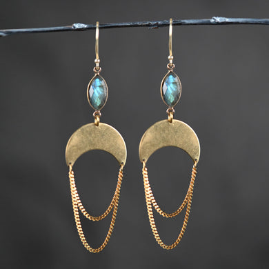 Brass Hammered Crescent Moon w/ Semi Precious Earrings: Iolite