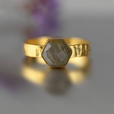 Golden Rutile Hexagon Ring on a Hand Hammered Band