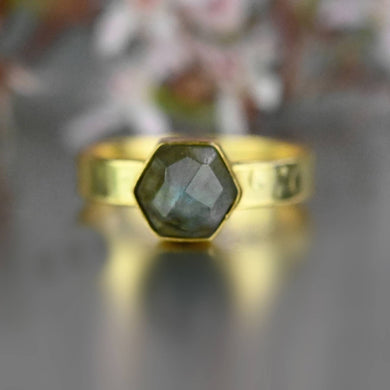 Labradorite Hexagon Ring on a Hand Hammered Band