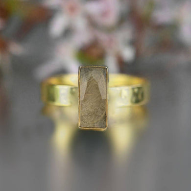 Rectangle Golden Rutile Ring on a Hand Hammered Band