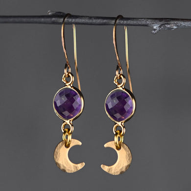 Tiny Brass Hammered Moons w/ Round Semi Precious Earring: Amethyst