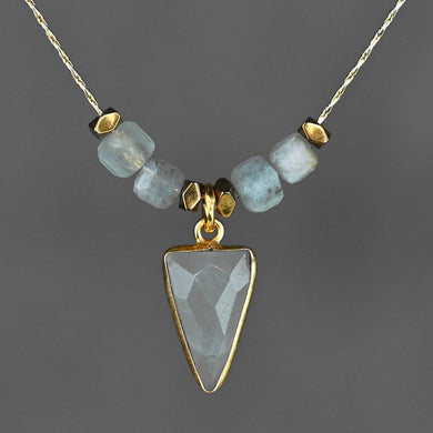 Delicate Semi Precious Cube w/ Triangle Drop Necklace: 14 + Extender / Aquamarine Cube & milky Aquamarine