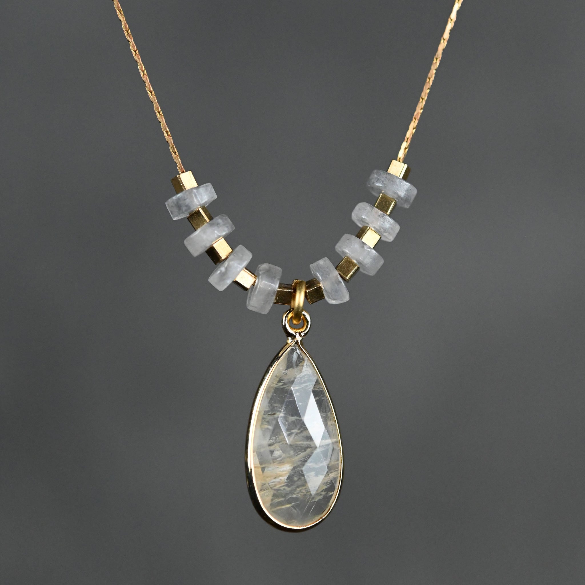 This necklace features Cloudy Crystal & a large Rutilated Quartz Tear Drop on delicate vintage chain. Wear it alone, or layer it up!!