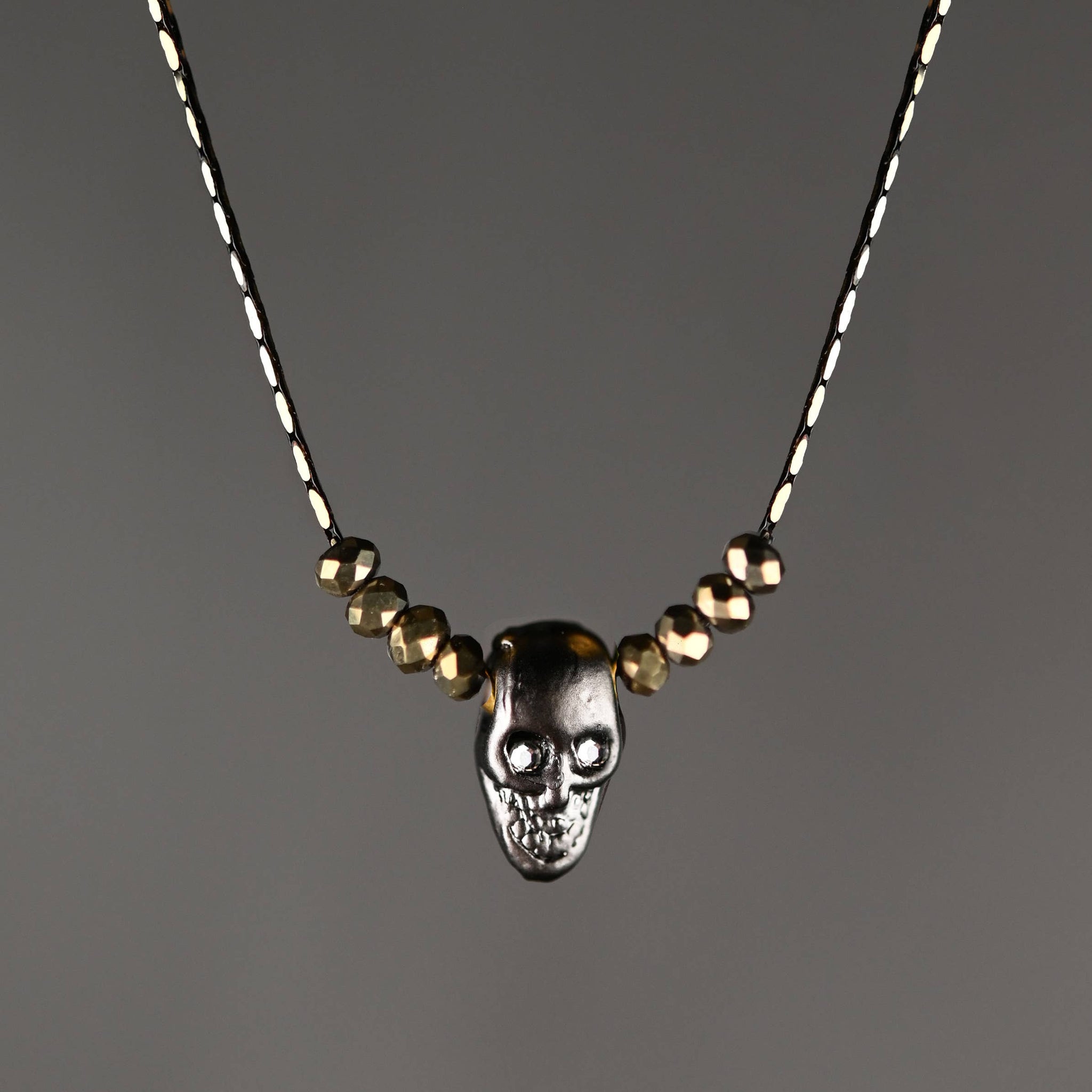 Hematite Skull w/ Gold Crystals & Crystal Eyes Necklace: 16 + Extender / Gold