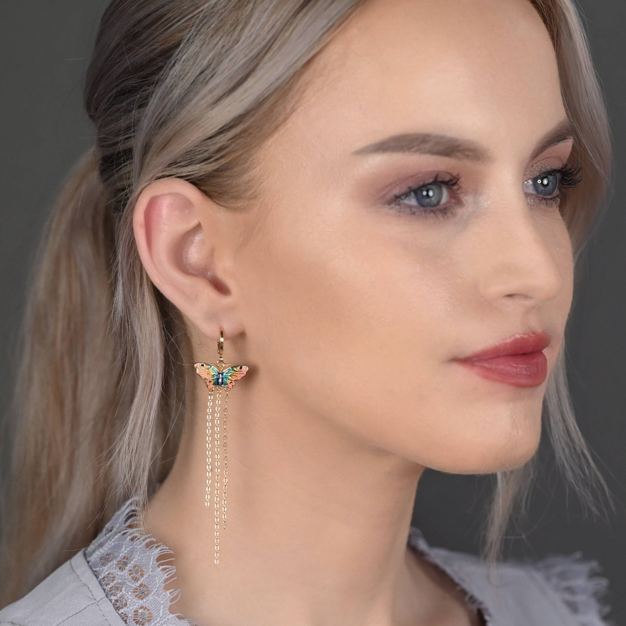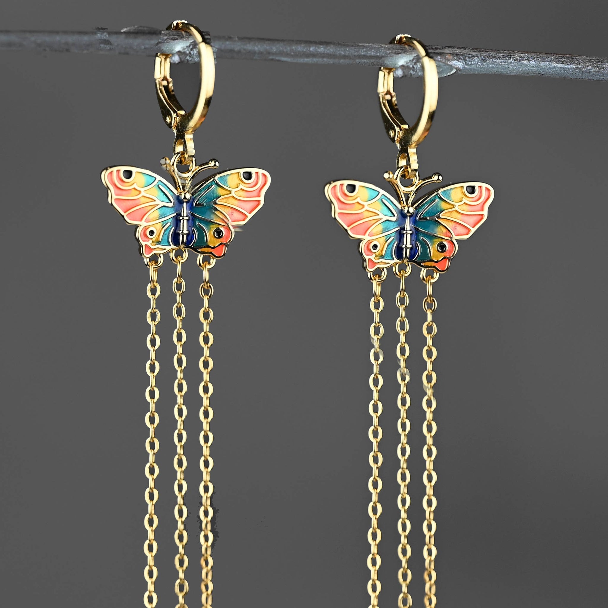 Beautiful colored Enamel Butterflies with cascading delicate chain hang from golden Huggies.