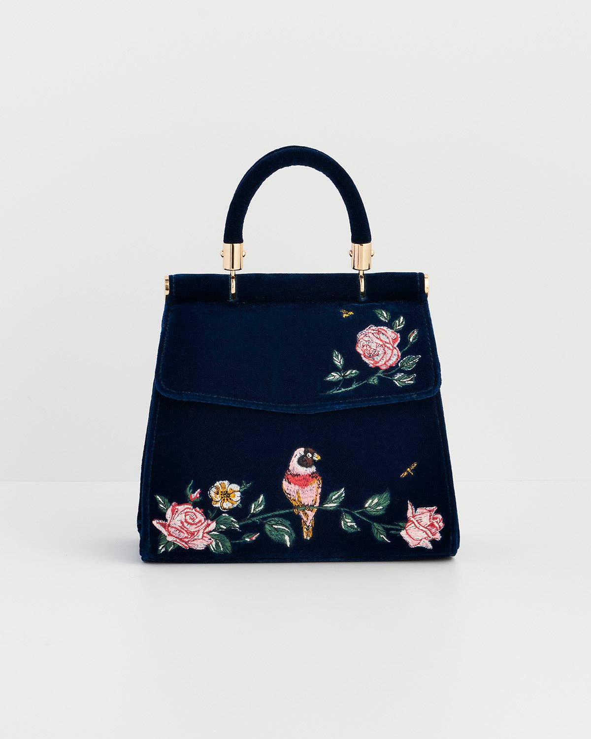 Add a touch of timeless elegance to your collection with the Rosy Posy Mini Top Handle Tote, a beautifully crafted accessory that marries vintage charm with modern versatility. Embroidered with a delicate songbird perched on a rose branch, this rich midnight blue tote tells a story of strength and resilience, perfect for the discerning customer seeking both style and meaning. DESIGN DETAILS: Featuring intricate rose and posy embroidery on a soft-sheen midnight blue fabric, the bag is finished with a polished gold-tone top handle and a removable chain strap for shoulder or crossbody wear. Compact yet roomy enough for daily essentials, it also includes an internal zipped pocket to keep valuables secure, all made from durable, easy-care materials. COMPLETE THE SET: Display this elegant tote alongside the matching Rosy Posy Jewellery Box for a complete romantic display that will captivate floral lovers and vintage romantics alike. MATERIALS: Outer: 90% Polyester, 10% Polyurethane; Lining: 100% Polyester MEASU