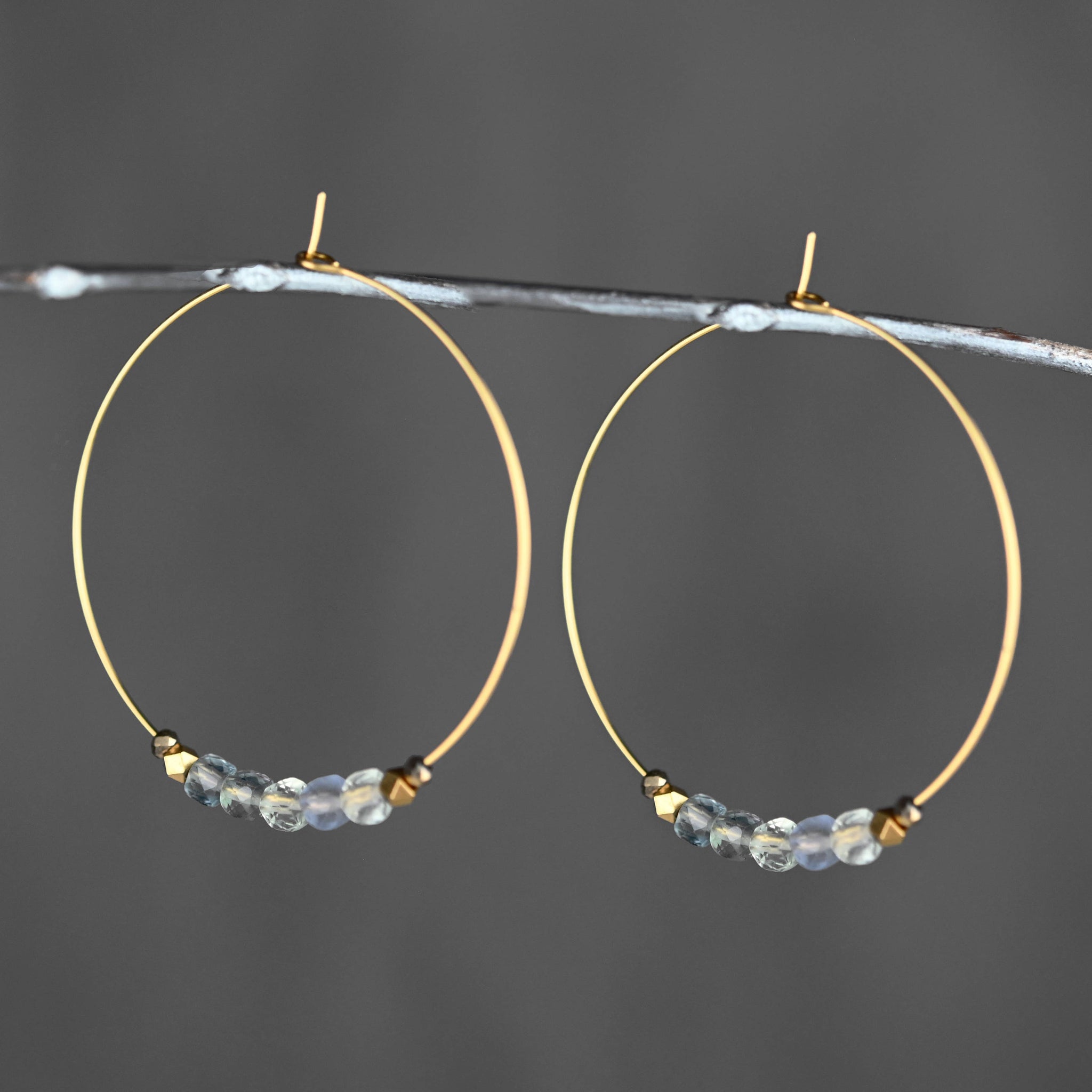 These are beautiful hoops with faceted Semi Precious Crystals and tiny Gold Crystals. Metal:Brass Size: Approx 2” Handmade with Art & Soul