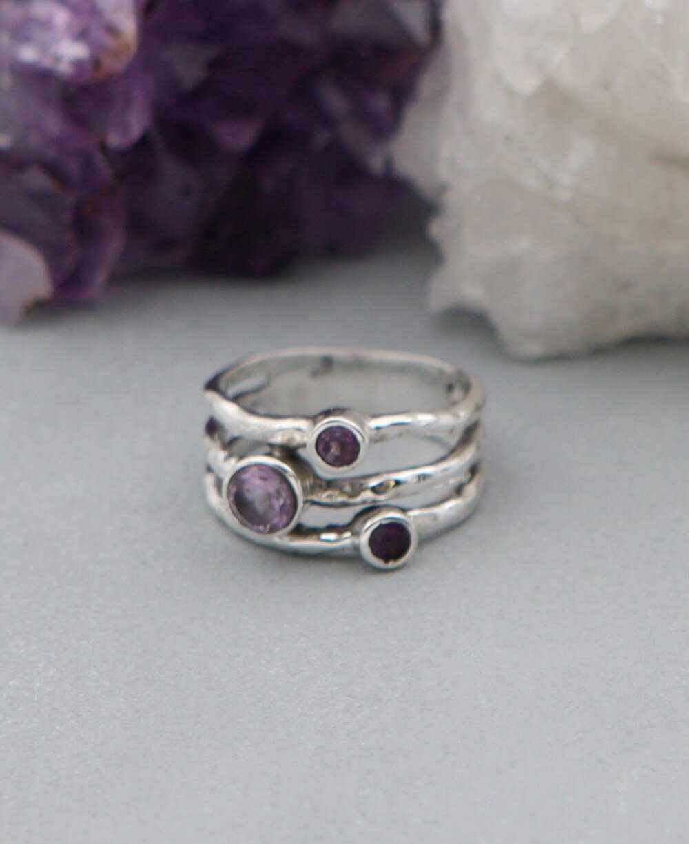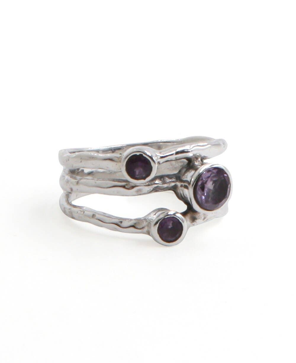 They say good things always come in threes. Such is the case with this elegant gemstone ring; triple stones means a triple dose of healing energy. Three faceted amethyst stones are nestled on textured bands of sterling silver. Amethyst is coveted for its calming properties and is said to inspire spiritual growth and divine wisdom. The gemstones are slightly different sizes for a unique asymmetrical look, each measuring 3mm to 5mm wide. Ring band is about 0.375 inches wide total. Available in sizes 6-9.