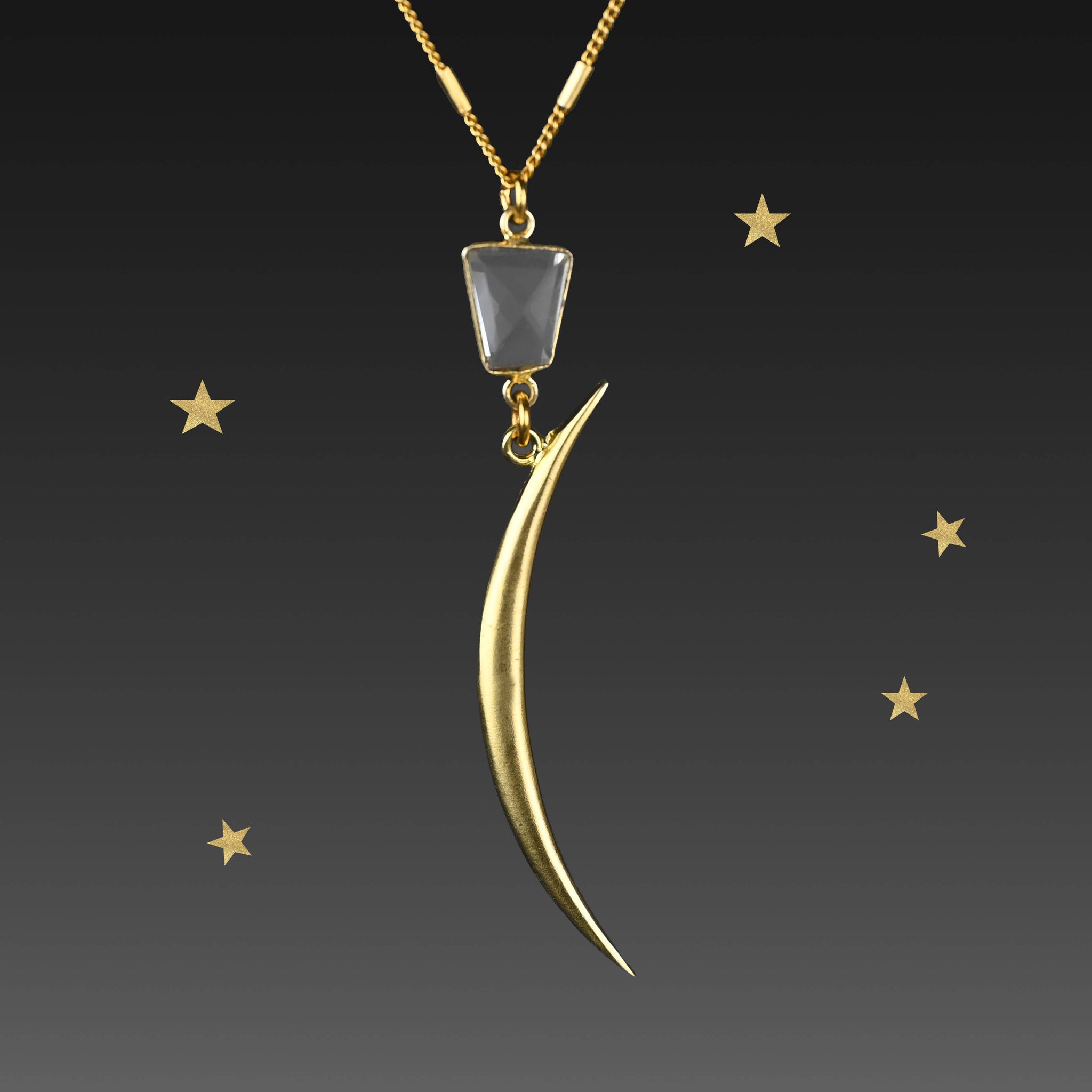 Sleek & Elegant & Mystical. A Brass cast Moon hangs from a beautiful Faceted Crystal on delicate bar chain.