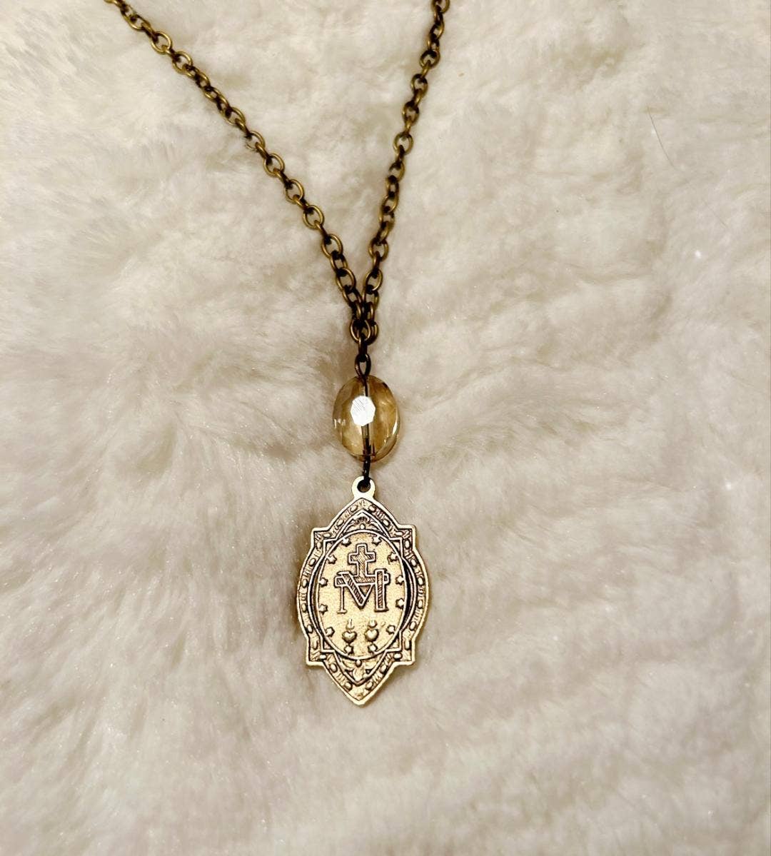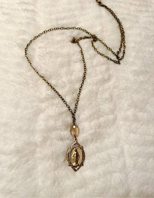 Bronze Gold Mary Necklace with clear swarovski on 30 inch necklace