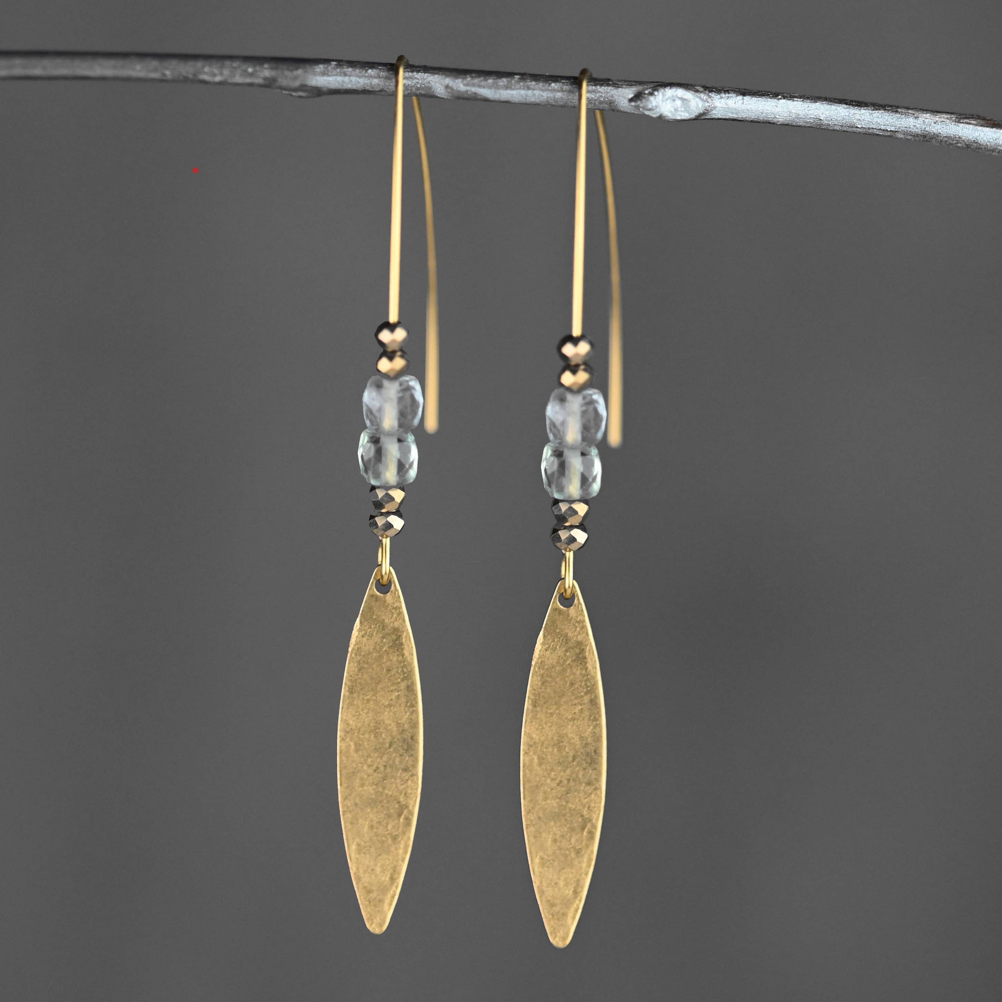 Hammered Brass Marquise Long Wire & Fluorite Earrings: Aquamarine