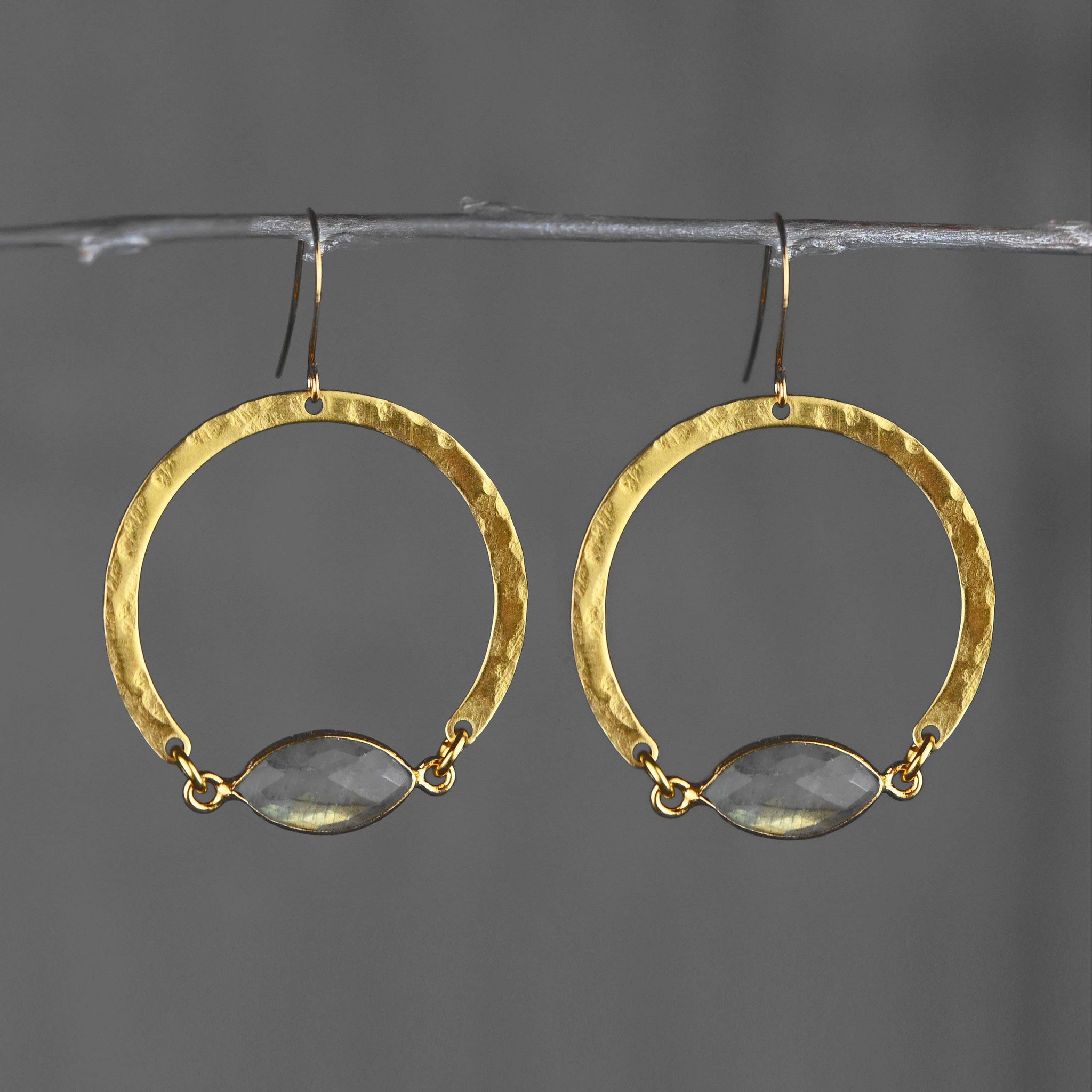 Love these simple Hammered Hoops that feature a beautiful marquise Semi Precious Gemstone. Metal: Brass / Earwire Gold Plated over Brass Stone: Choose Semi Precious Size: Approx 2.25 inches. Handmade with Art & Soul in Los Angeles