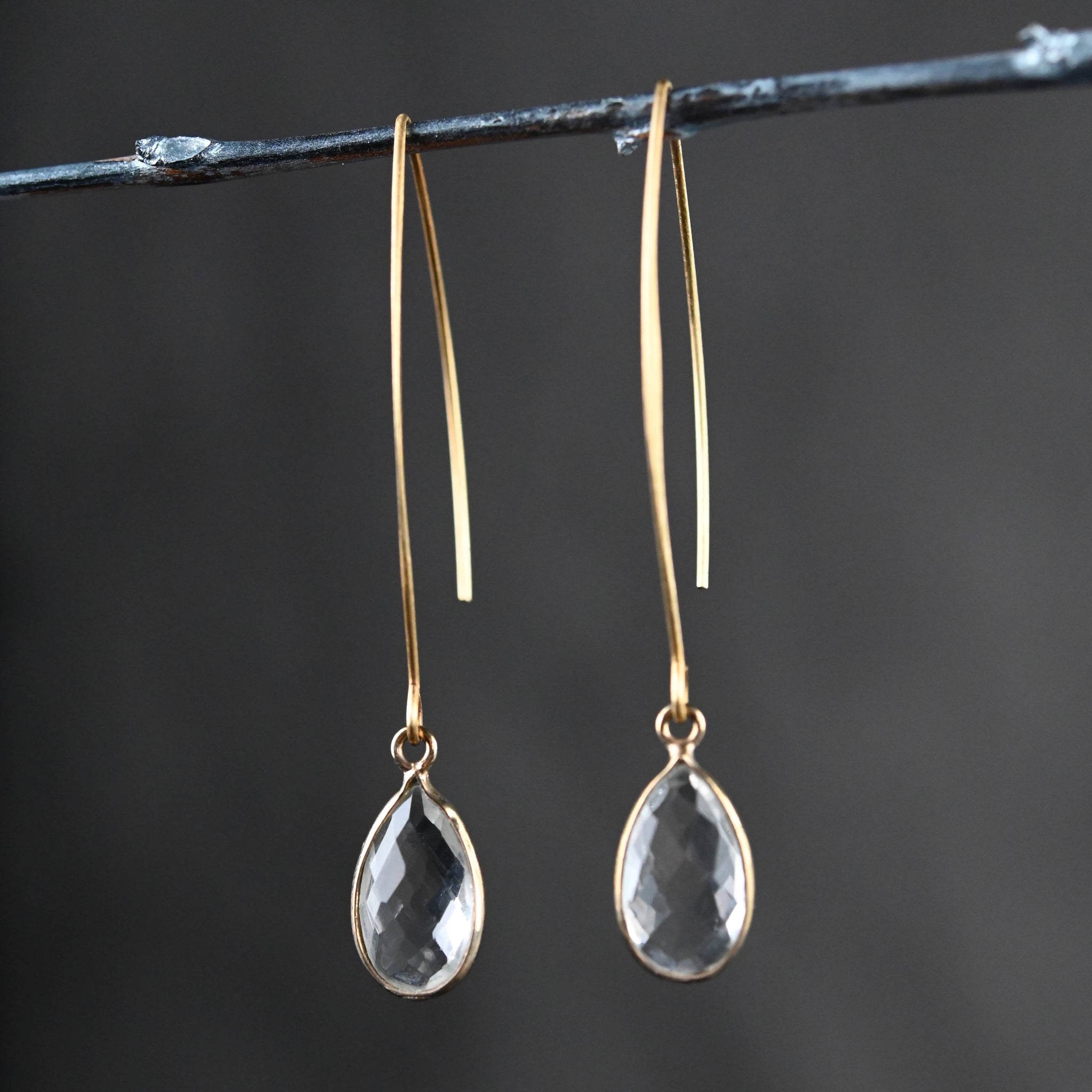 This earring is simple, modern & effortlessly cool. Metal: Brass / Earwire Gold plated Brass Stone: Choose Crystal Quartz, or Aqua Hydro Quartz (man made) Size: Approx 2.25 inches. Handmade with Art & Soul in Los Angeles