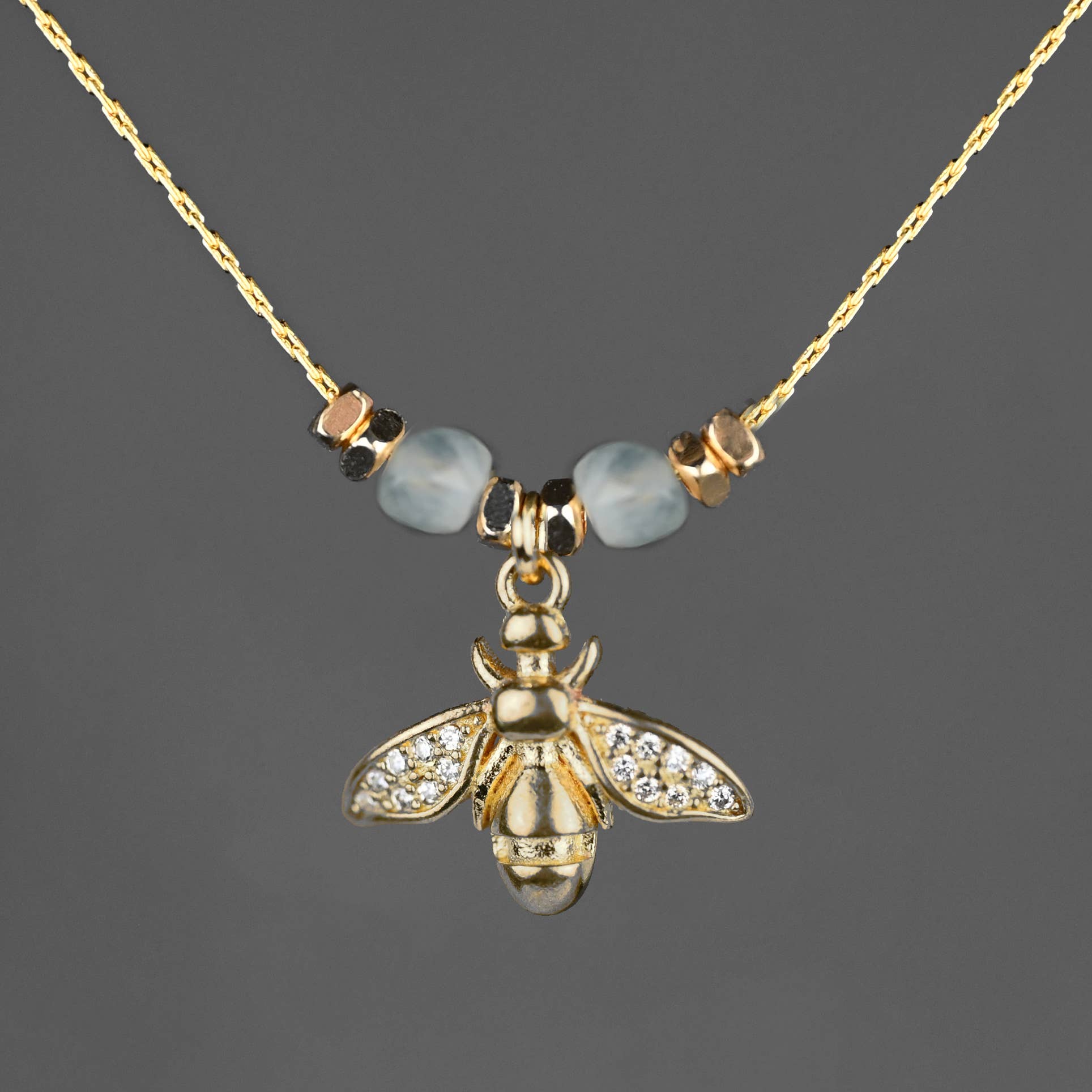 A touch of Vintage and Semi Precious Stones on very delicate chain. This necklace features a small brass cast Bee with tiny delicate Crystal detail. Bees are considered powerful symbols of community and regeneration. As the source of honey, they also represent sweetness, healing and magic. Wear it alone, or layer it up!! Metal: Brass CharmChain: Brass plated 18k Chain Length: 14 + Extender Handmade with Art and Soul