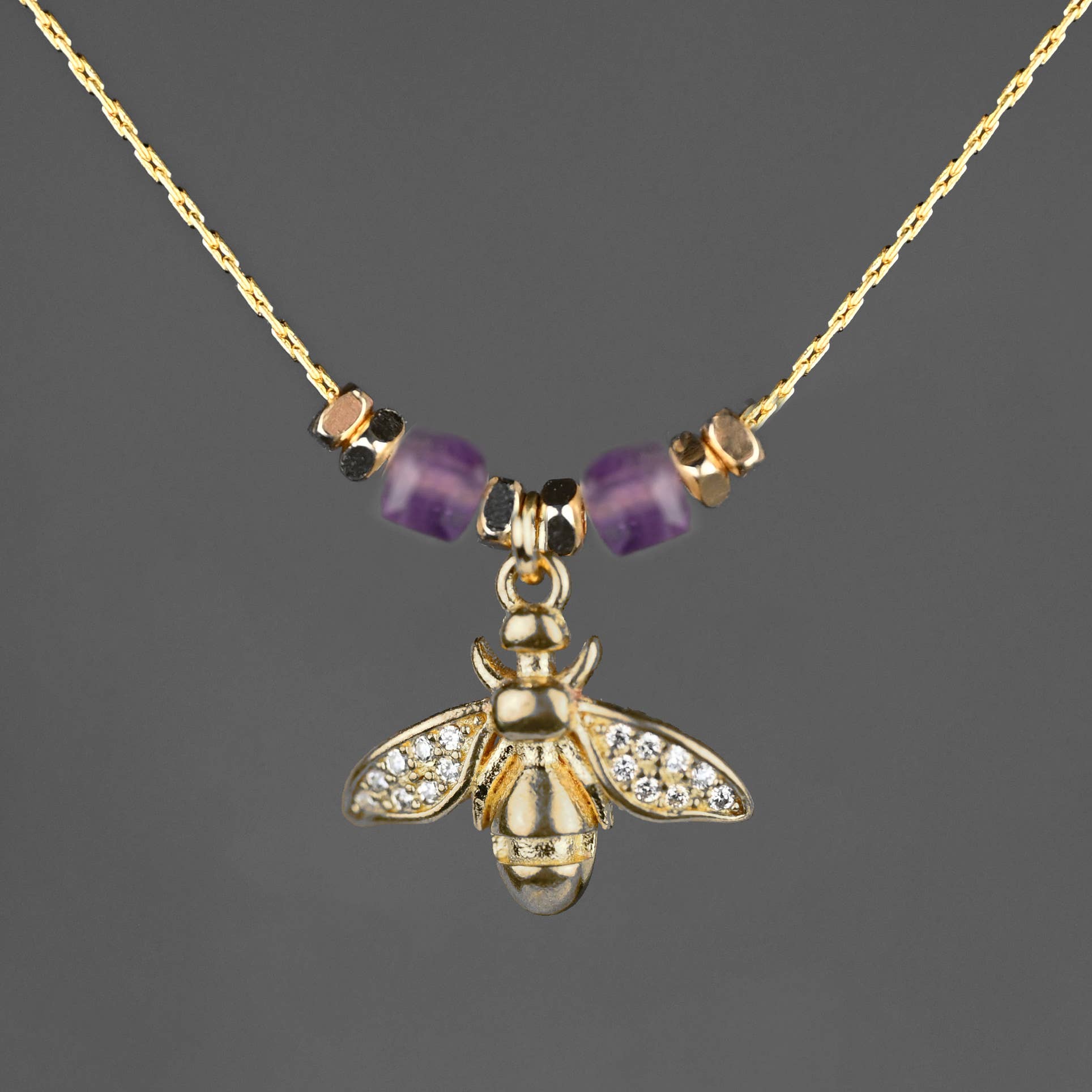 Vintage Pave Bee w/ Semi Precious Stones Necklace: Amethyst / 16 + Extender